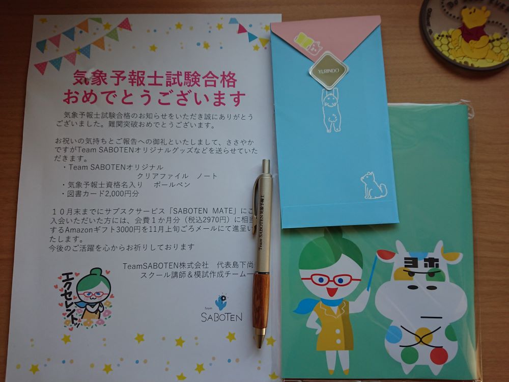 Team SABOTENに合格の報告をすると、図書券などがもらえる、つまり合格祝いをいただきました!